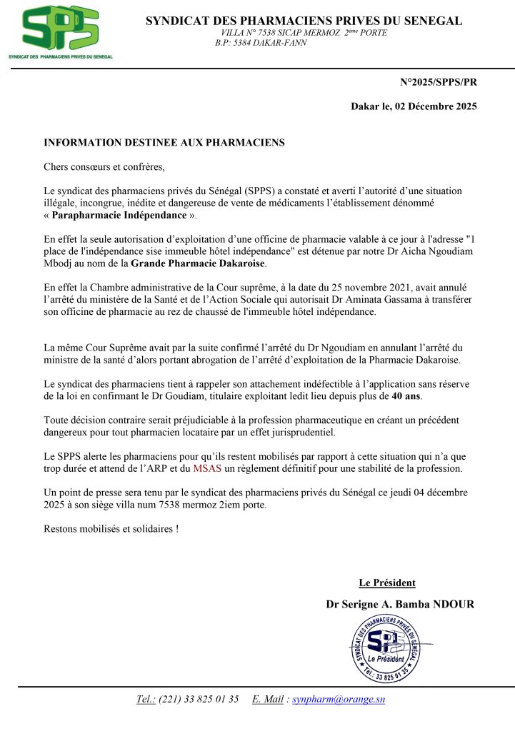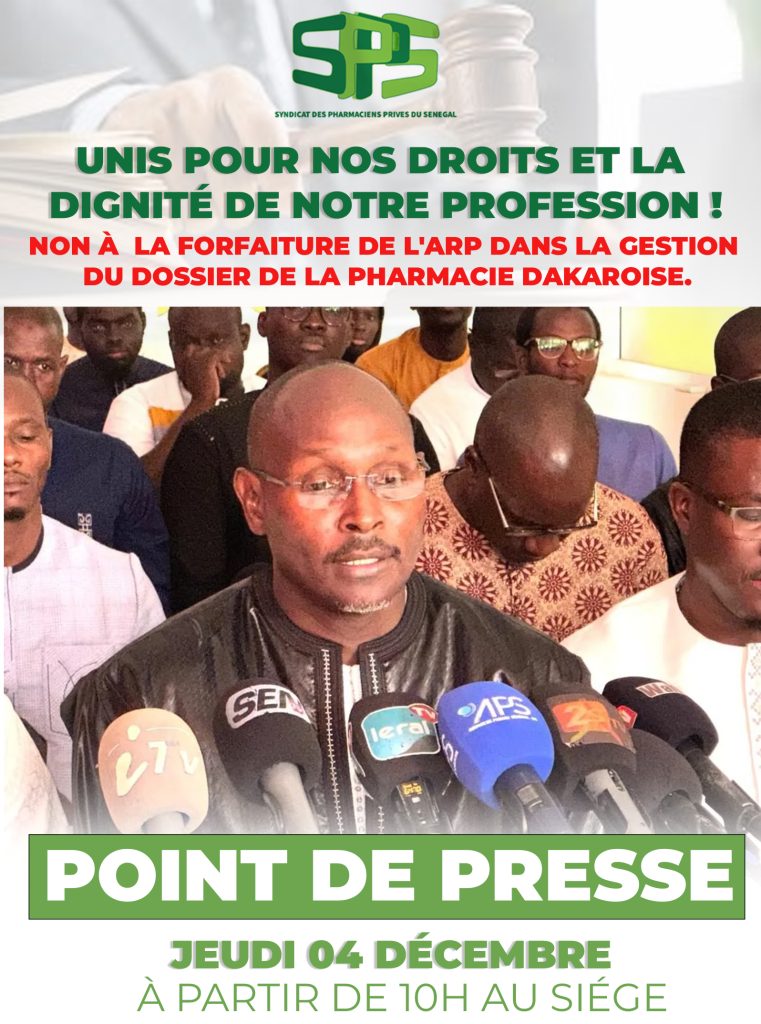 Le Syndicat des Pharmaciens Privés du Sénégal (SPPS) tiendra un point de presse ce jeudi 04 décembre 2025, à partir de 10 heures, dans son siège sis à la Villa n°7538, Sicap Mermoz, 2e porte.